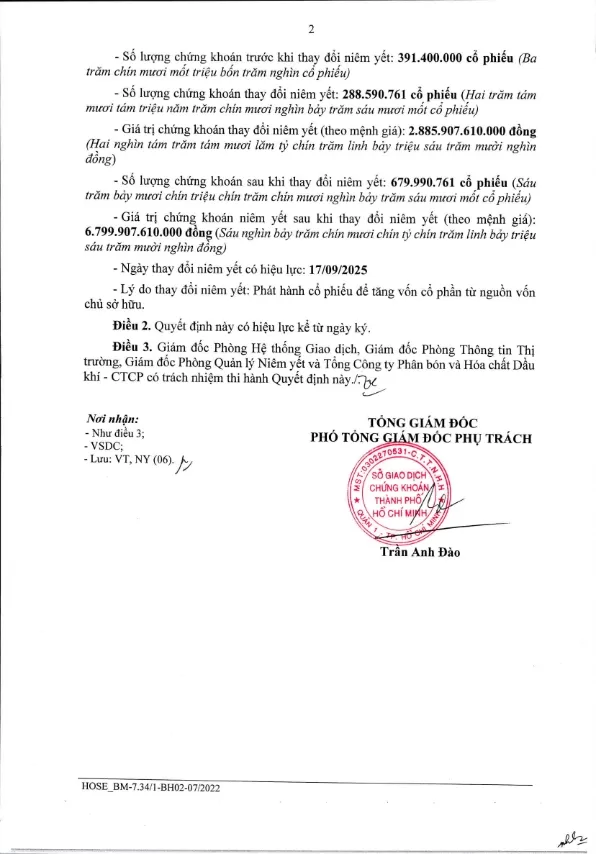 Ngày 16/9/2025 Tổng công ty Phân bón và Hóa chất Dầu khí – CTCP đã nhận được Quyết định số 793/QĐ-SGDHCM ngày 15/09/2025 của Sở Giao dịch Chứng khoán TPHCM về việc đăng ký thay đổi niêm yết. Theo đó, Tổng công ty được chấp thuận niêm yết bổ sung 288.590.761 cổ phiếu DPM, ngày hiệu lực là 17/09/2025. Tổng số cổ phiếu DPM niêm yết sau thay đổi là 679.990.761 cổ phiếu.