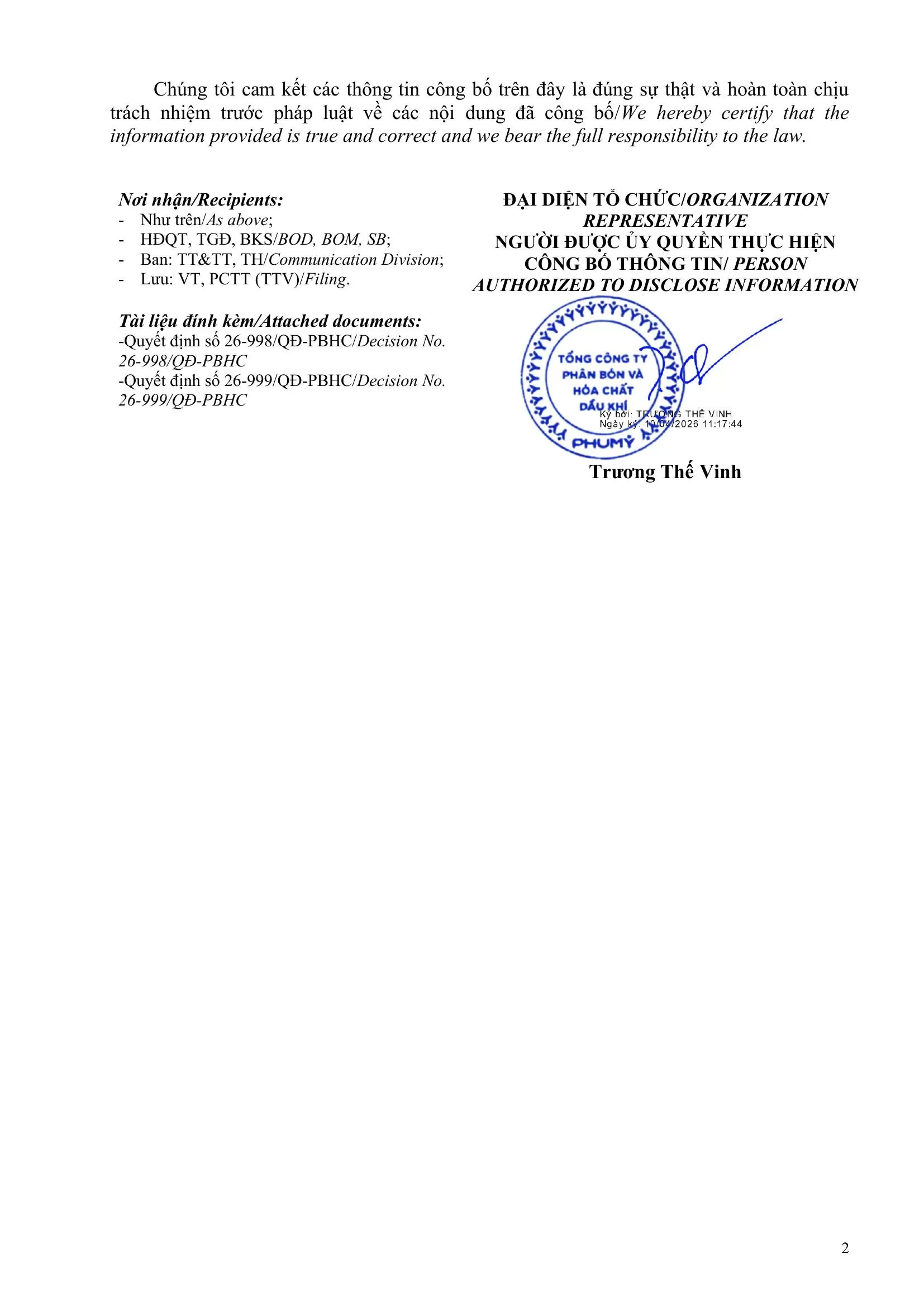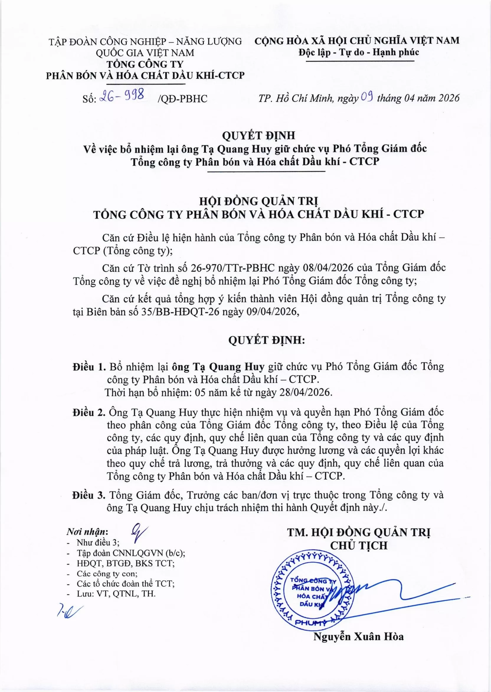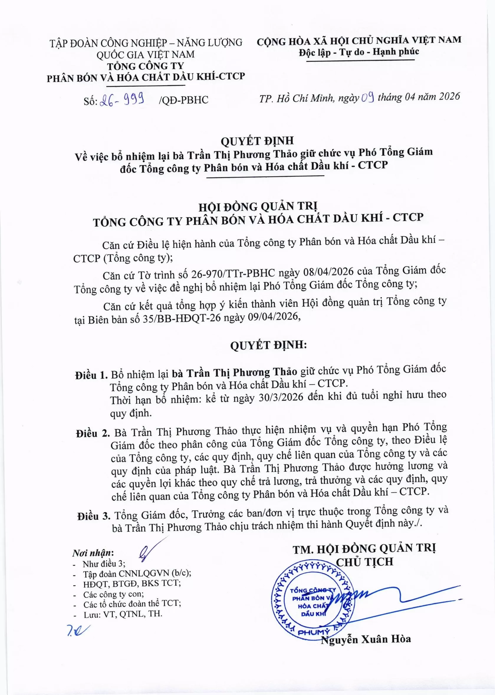 Công bố thông tin: Thông báo thay đổi nhân sự - bổ nhiệm lại phó tổng giám đốc
