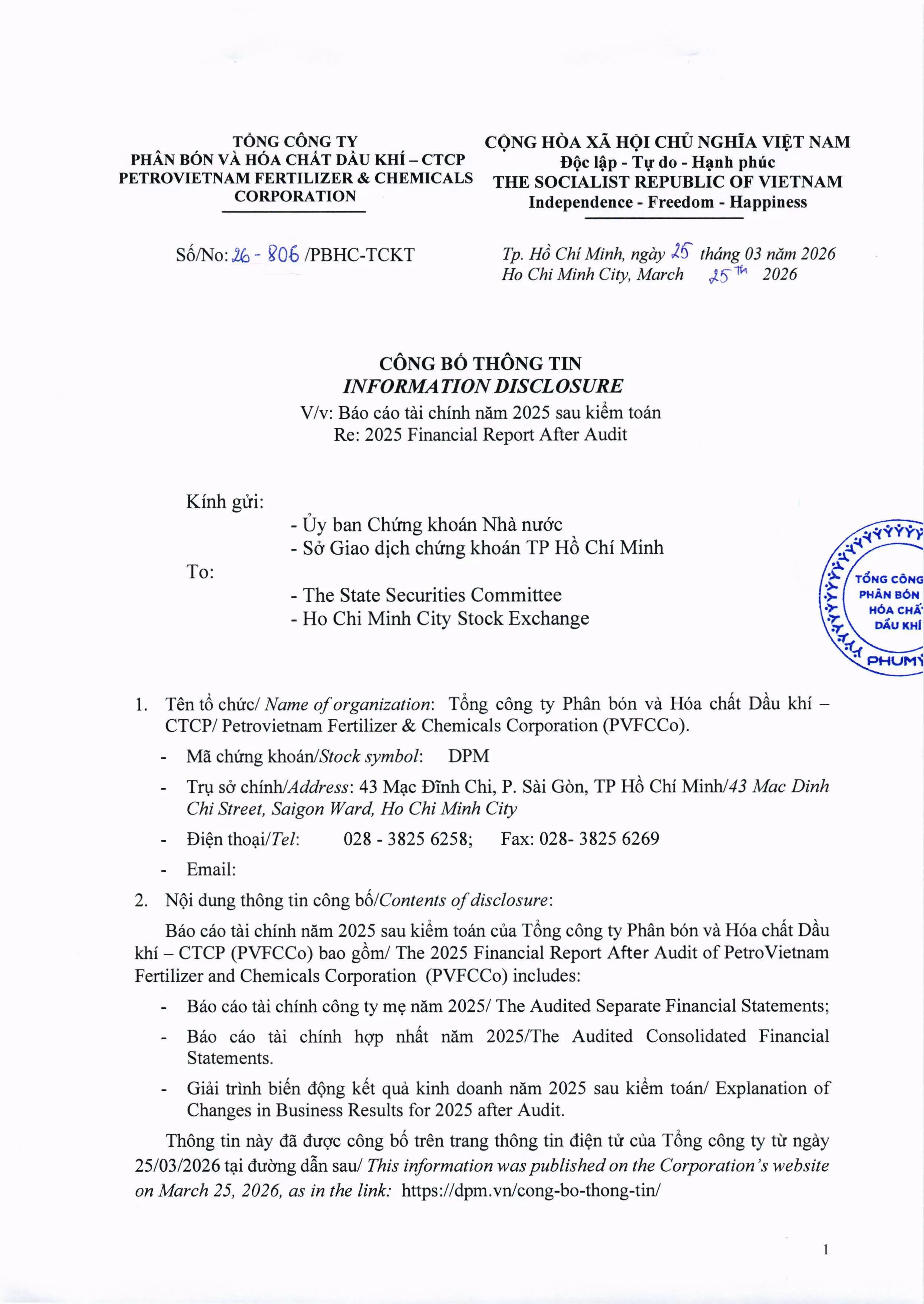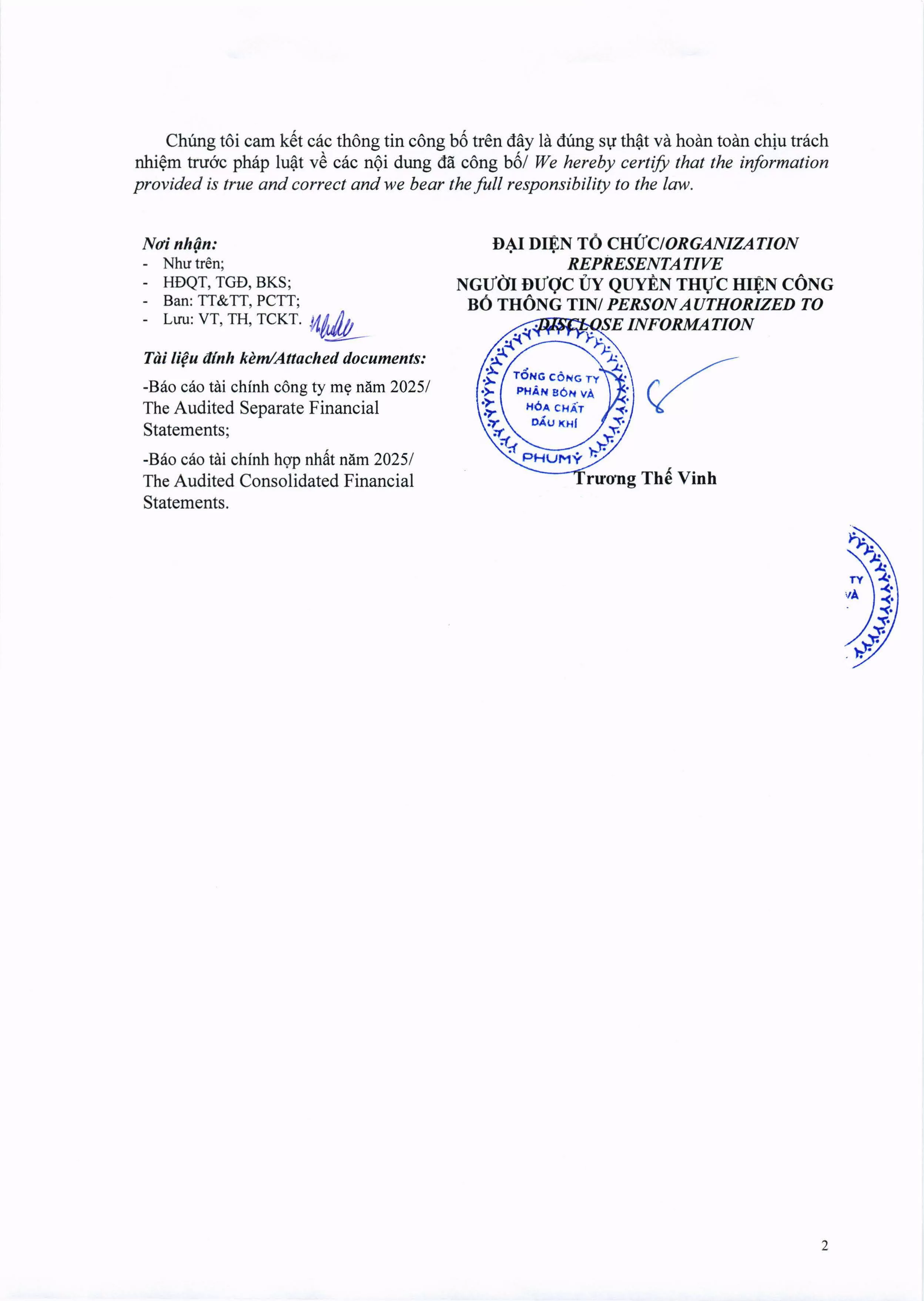 Công bố thông tin V/v báo cáo tài chính năm 2025 sau kiểm toán