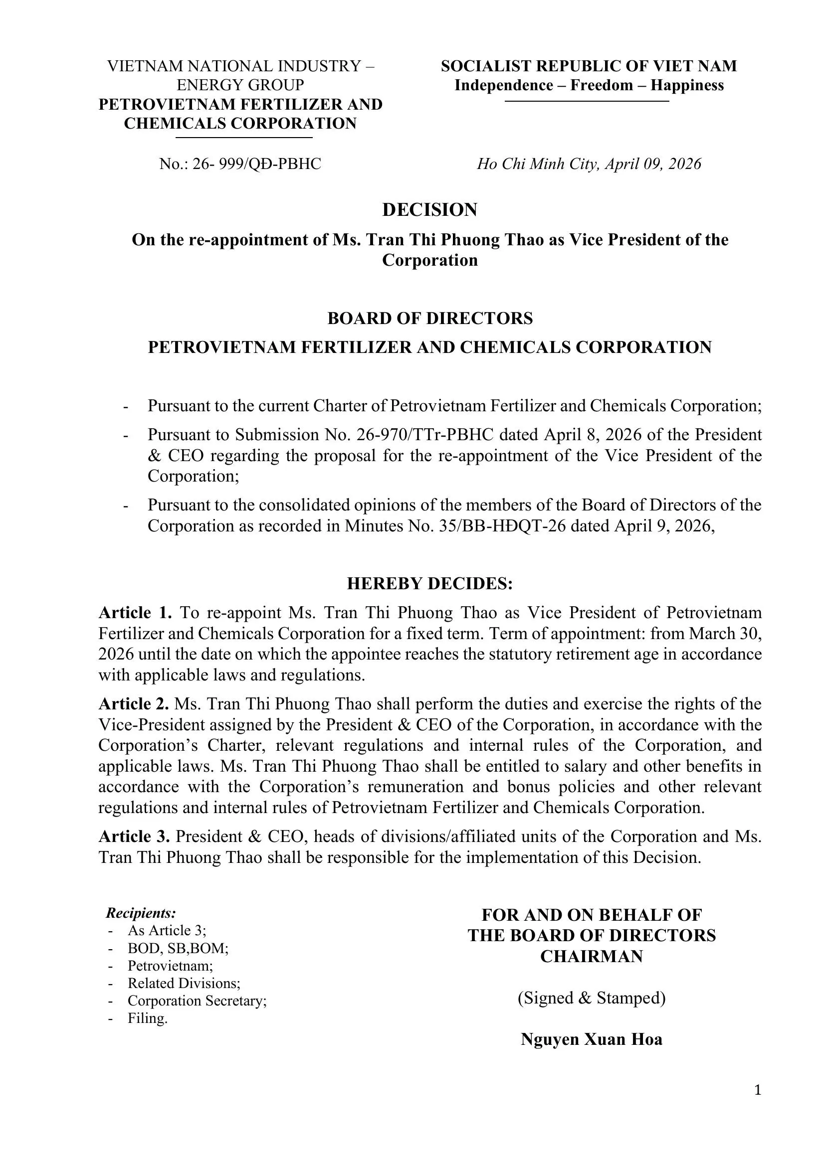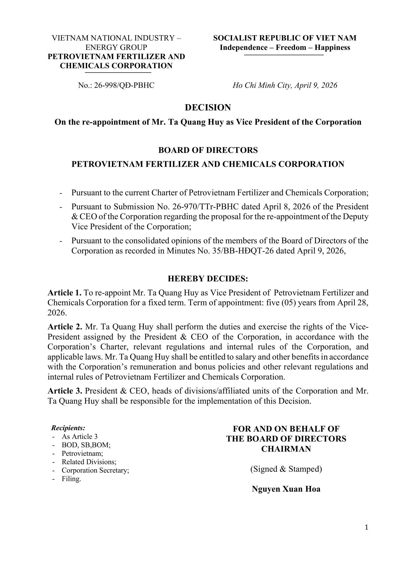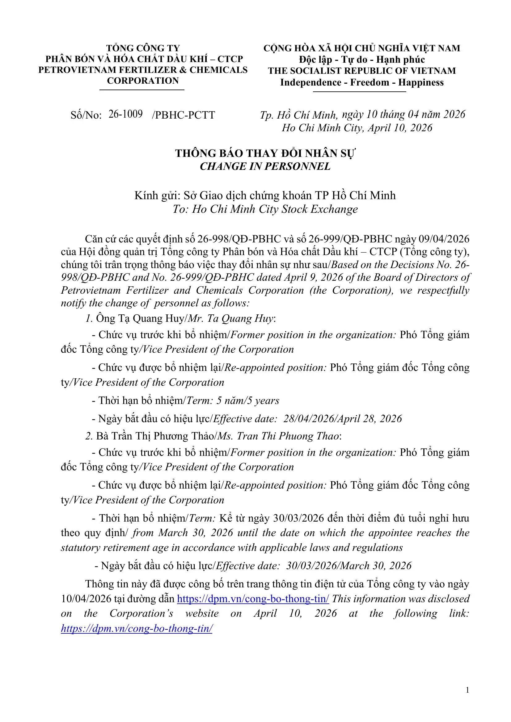 Information Disclosure: Change in Personnel - Vice Directors