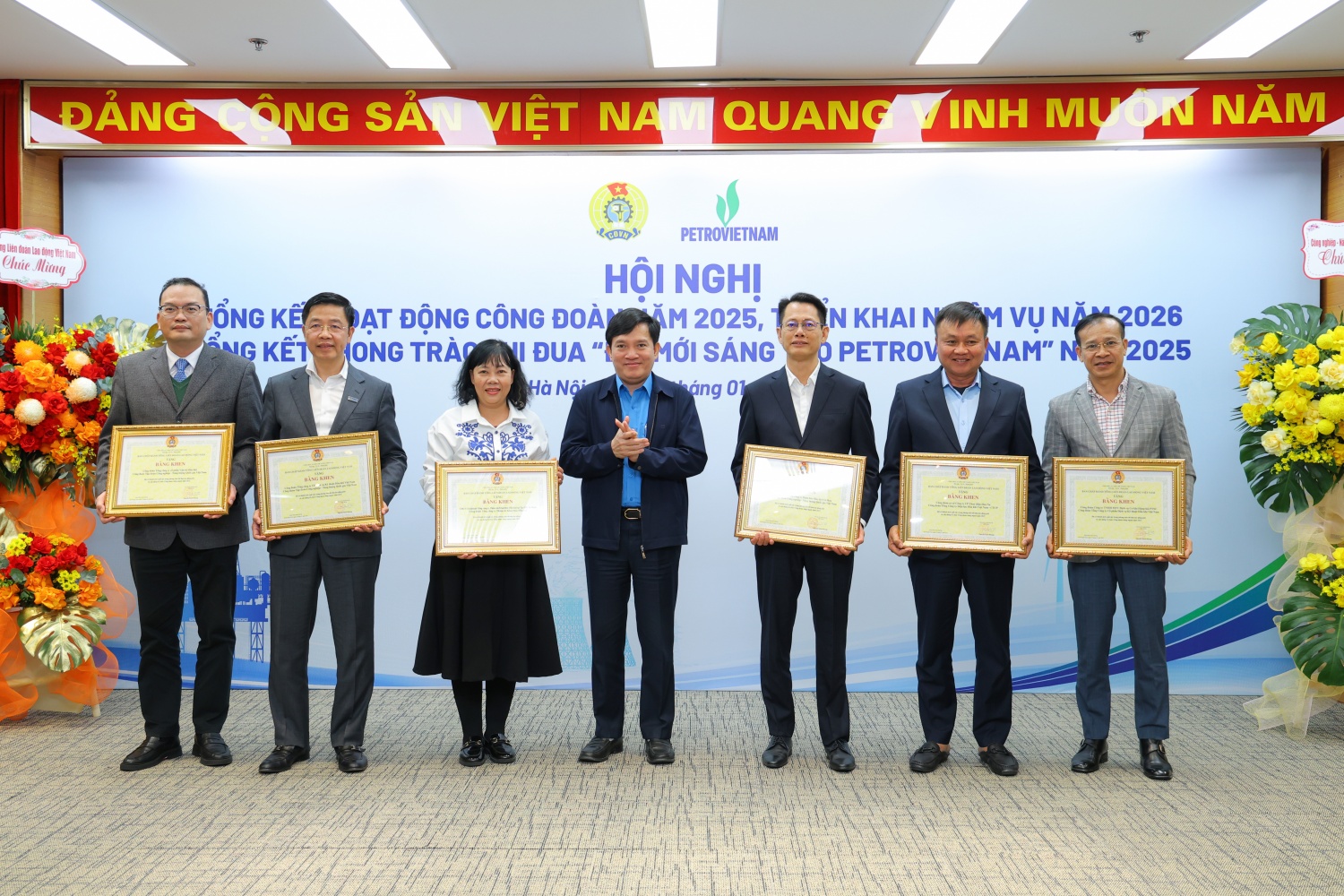 Tại hội nghị, Tổng Liên đoàn Lao động Việt Nam đã trao tặng Cờ thi đua cho các tập thể có thành tích xuất sắc trong phong trào thi đua lao động giỏi và xây dựng tổ chức công đoàn vững mạnh năm 2025. Các tập thể gồm: Công đoàn cơ sở Liên doanh Vietsovpetro; Công đoàn cơ sở Công ty CP Lọc hóa dầu Bình Sơn (BSR); Công đoàn cơ sở Tổng công ty Phân bón và Hóa chất Dầu khí (PVFCCo - Phú Mỹ); Công đoàn Tổng công ty Điện lực Dầu khí Việt Nam (PV Power) và Công đoàn Tổng công ty Khí Việt Nam (PV GAS).