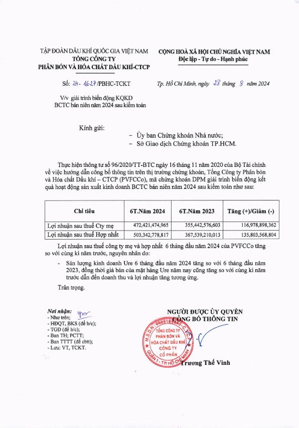 Công bố thông tin: Báo Cáo Tài Chính Bán Niên 2024 và giải trình biến động KQKD sau kiểm toán