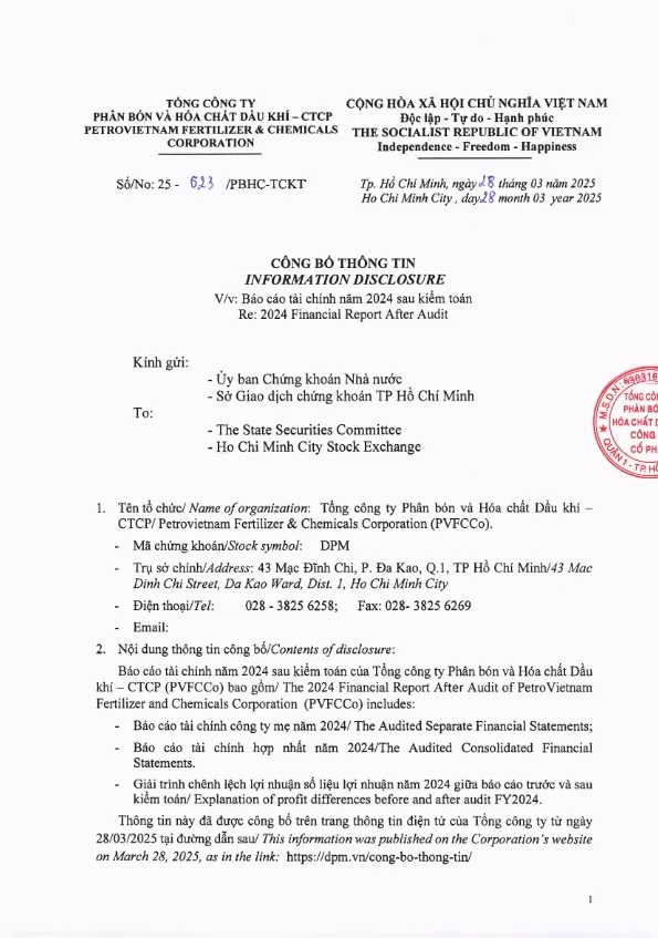 Công bố thông tin: Báo cáo tài chính năm 2024 sau kiểm toán