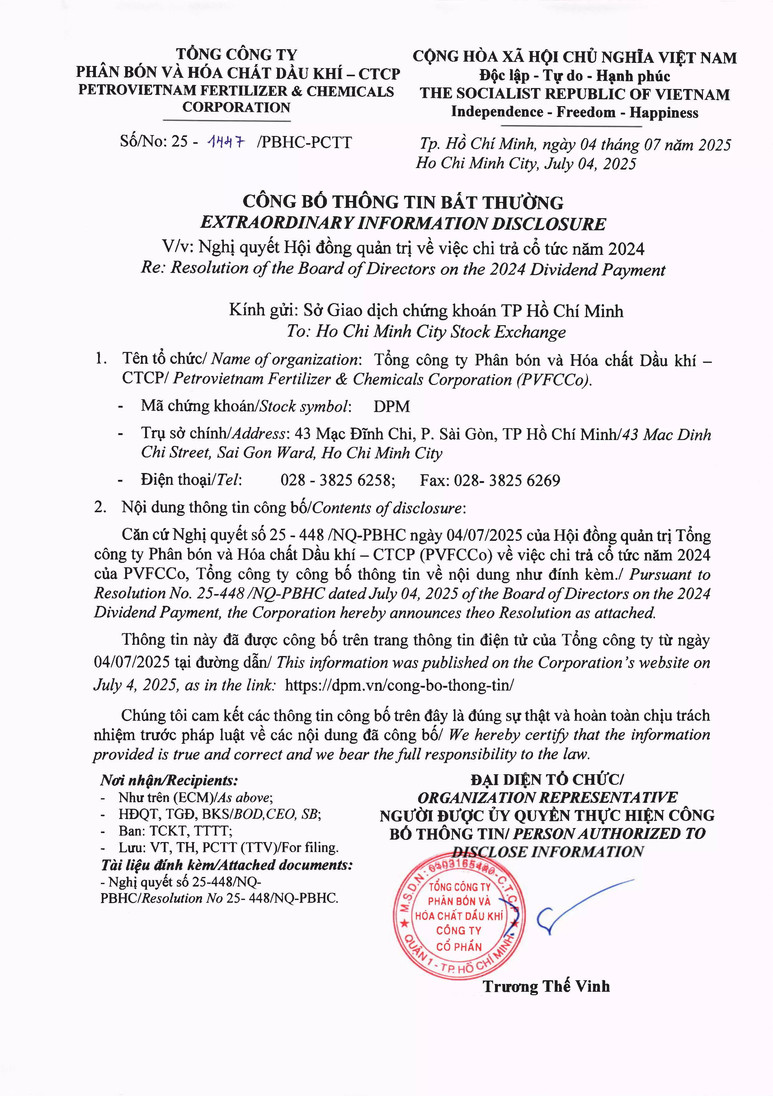 | 1 | Công bố thông tin bất thường về chi trả cổ tức năm 2024 |