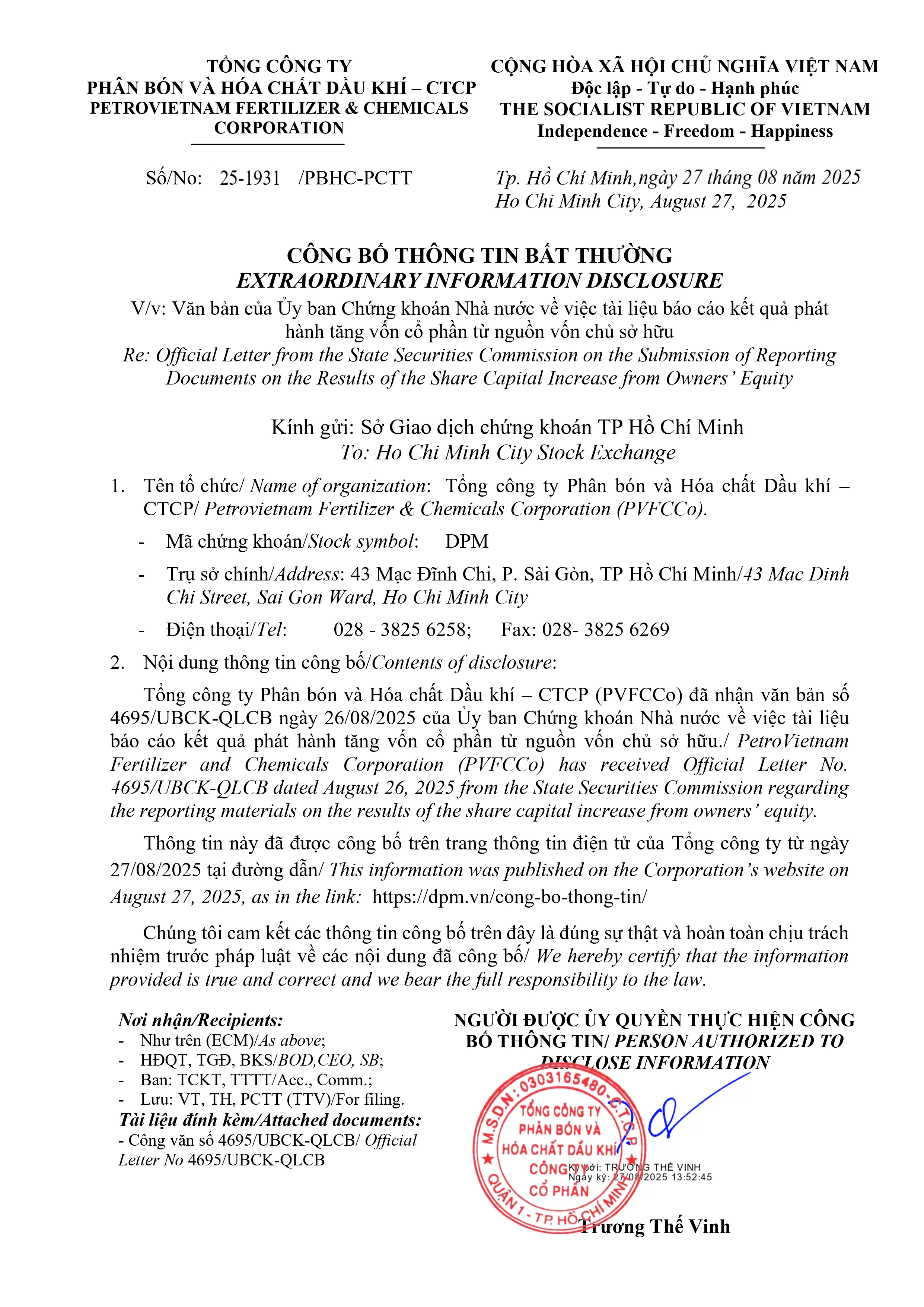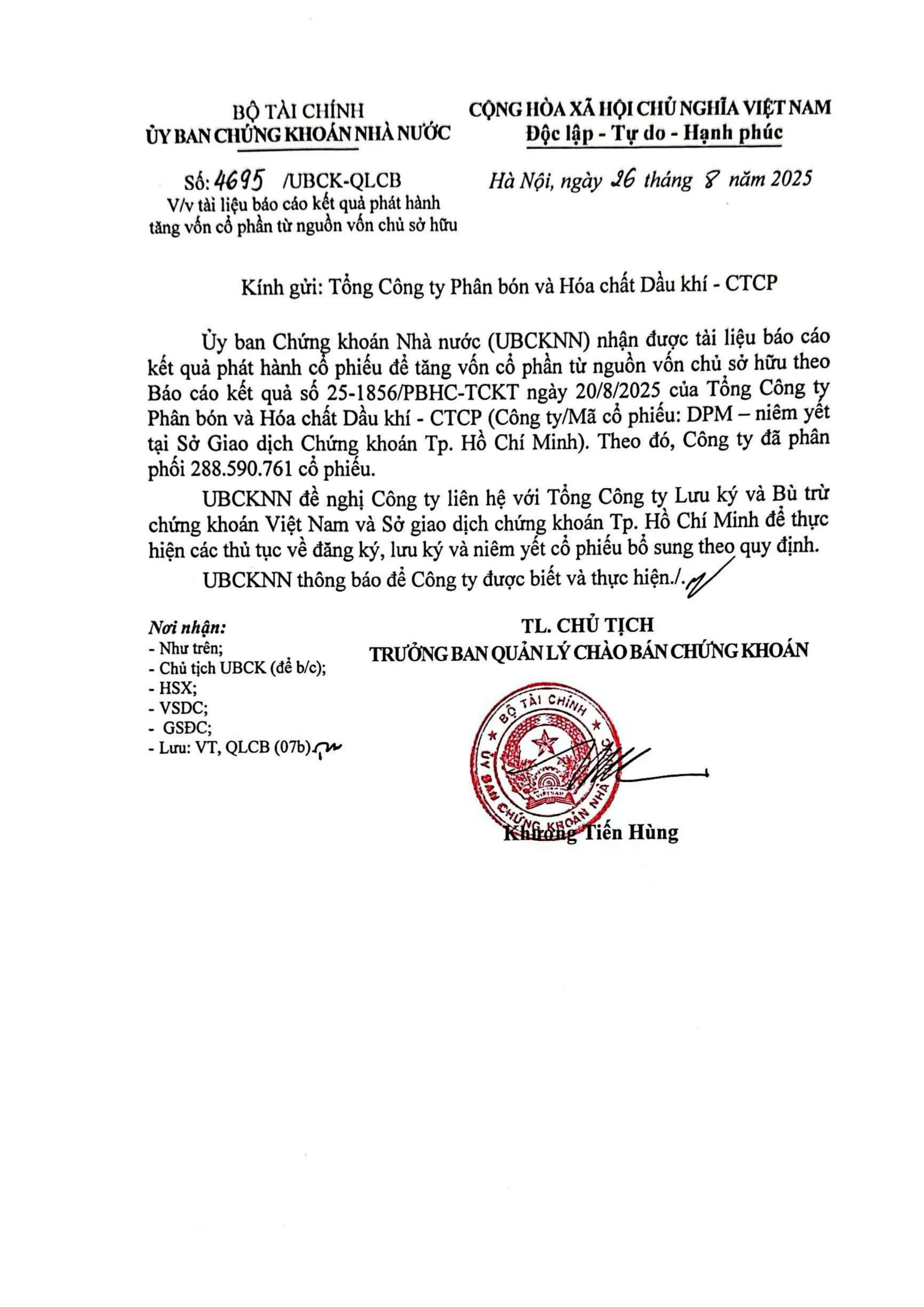 Công bố thông tin bất thường V/v: Văn bản của Ủy ban Chứng khoán Nhà nước về việc tài liệu báo cáo kết quả phát hành tăng vốn cổ phần từ nguồn vốn chủ sở hữu