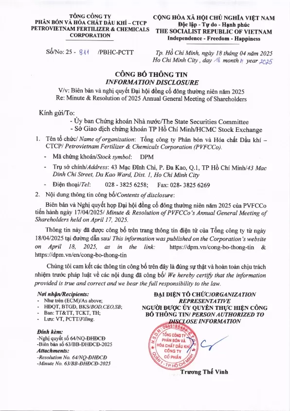 Công bố thông tin: Biên bản và nghị quyết Đại hội đồng cổ đông thường niên năm 2025