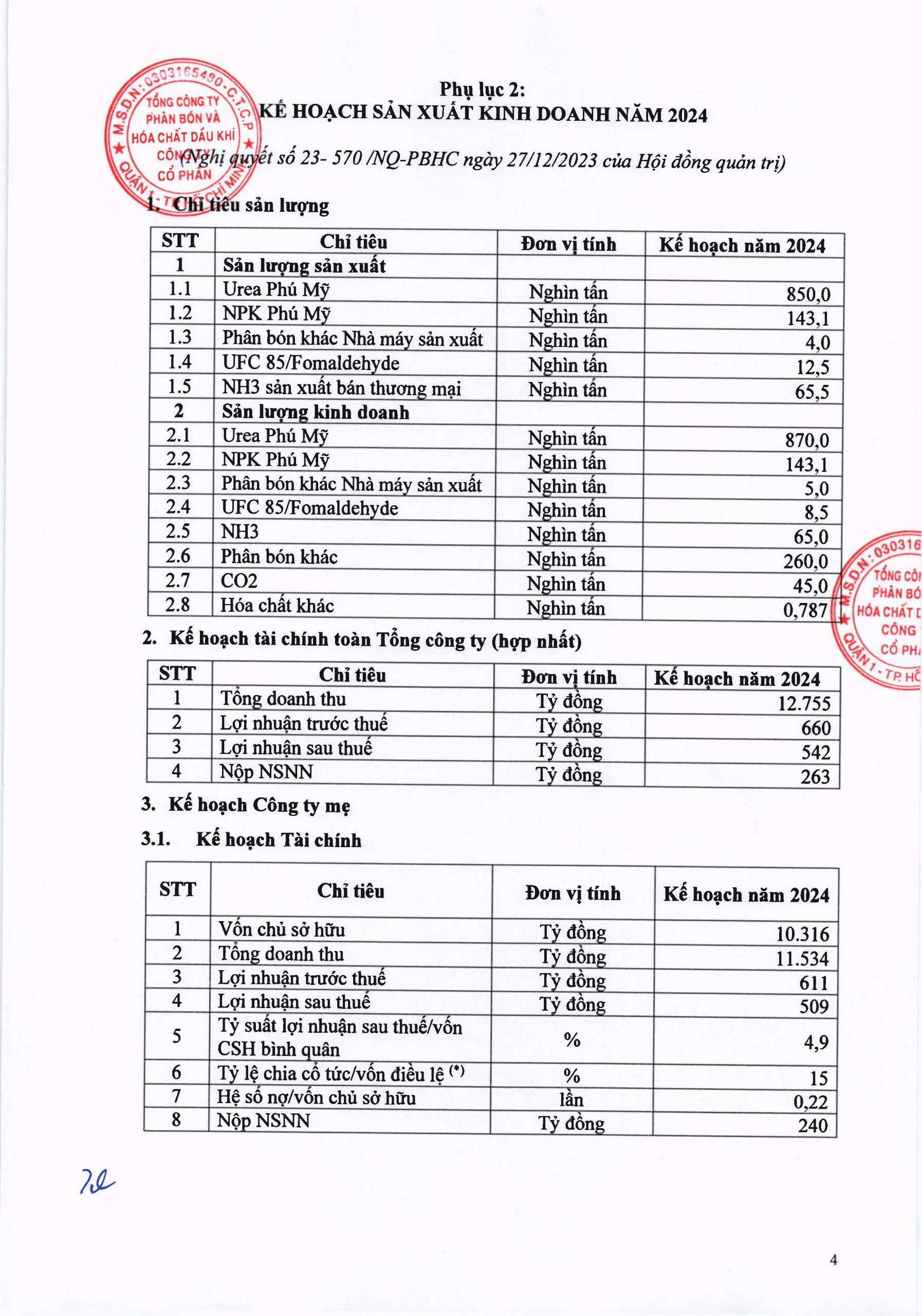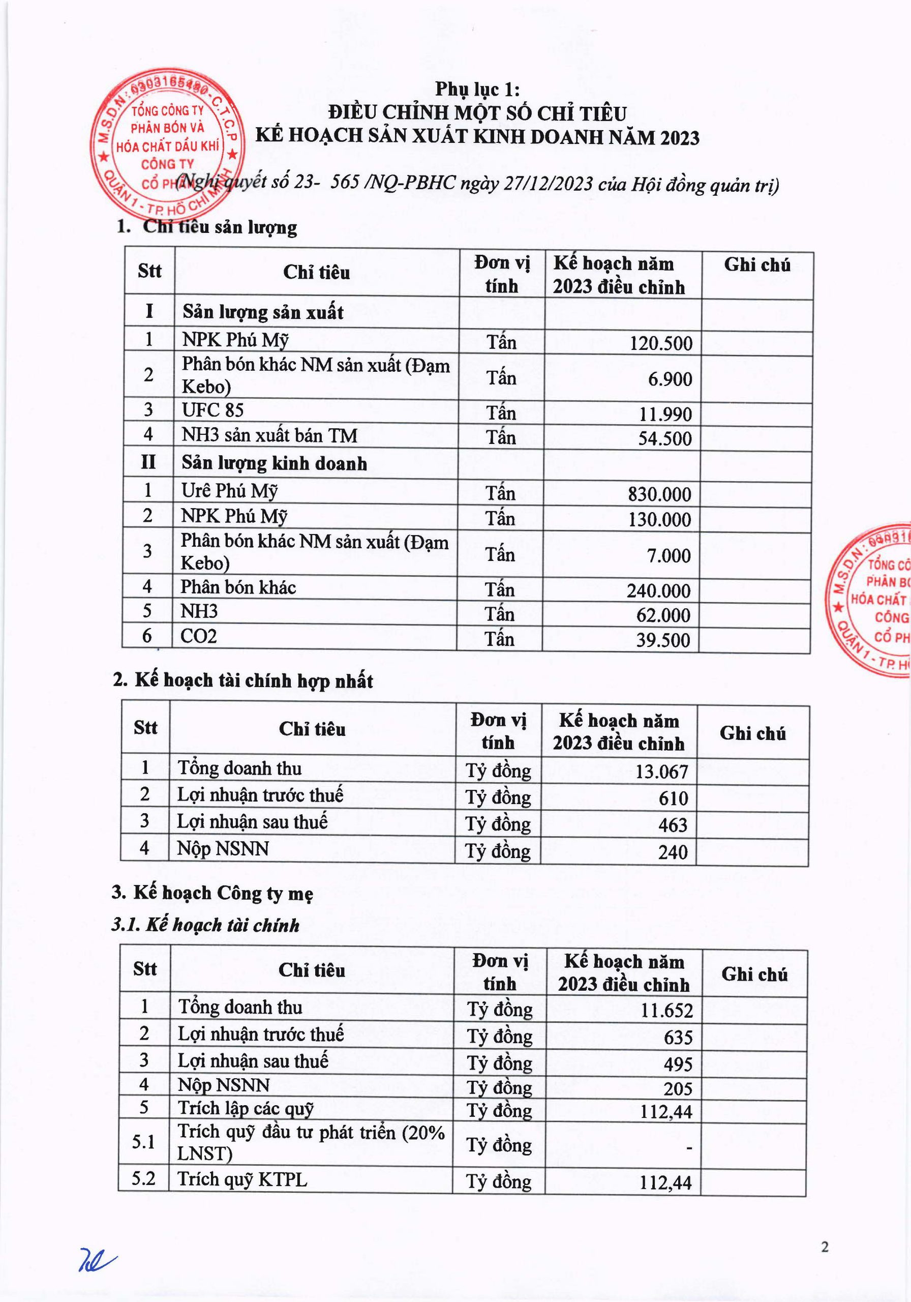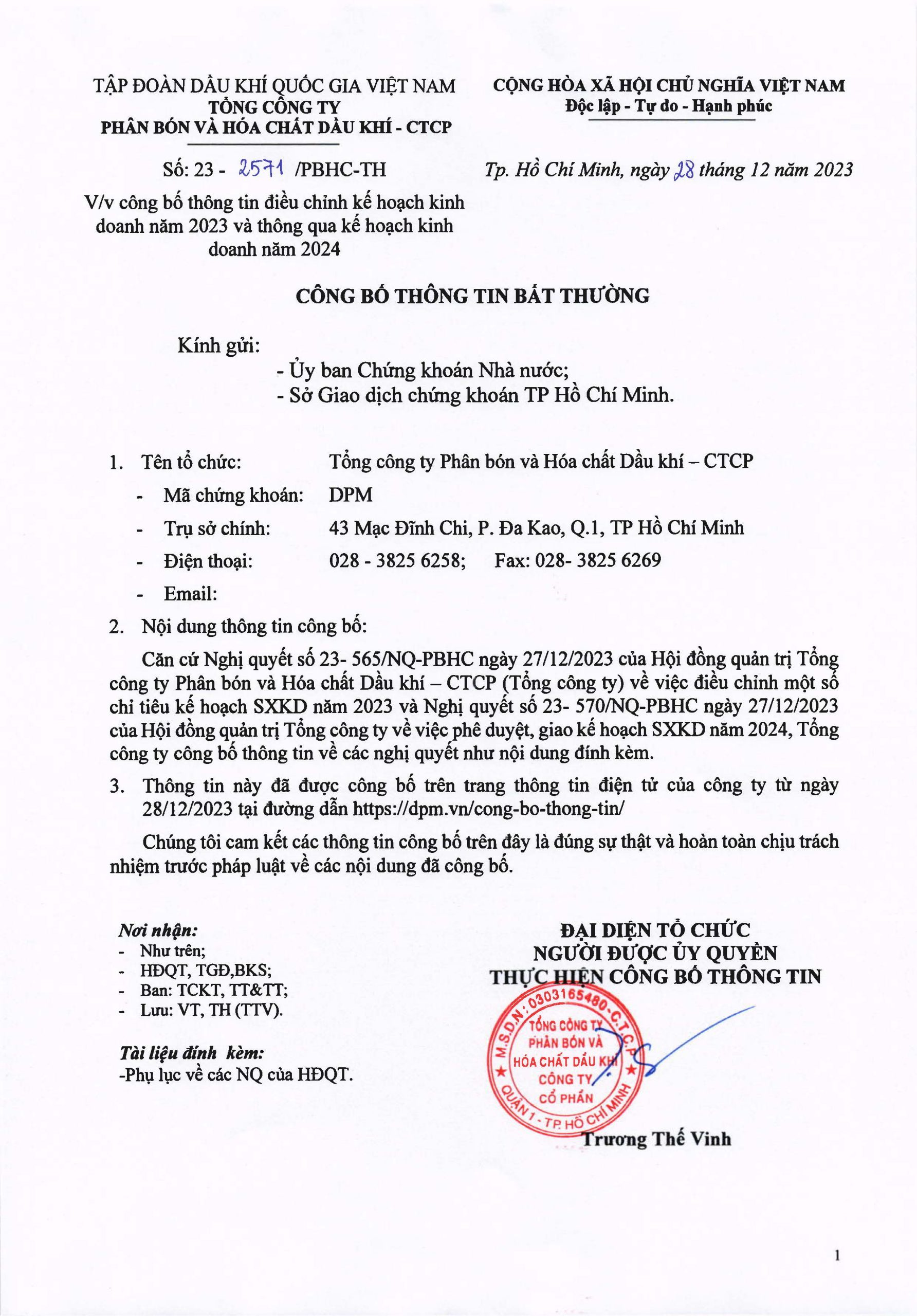 Công bố thông tin điều chỉnh Kế hoạch kinh doanh năm 2023 và thông qua kế hoạch kinh doanh năm 2024