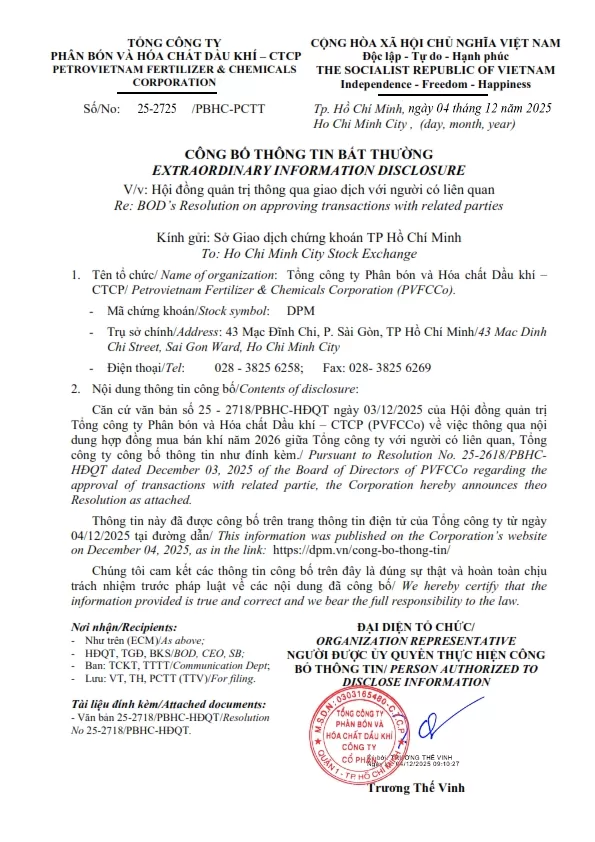Công bố thông tin: Hội đồng quản trị thông qua giao dịch với người có liên quan