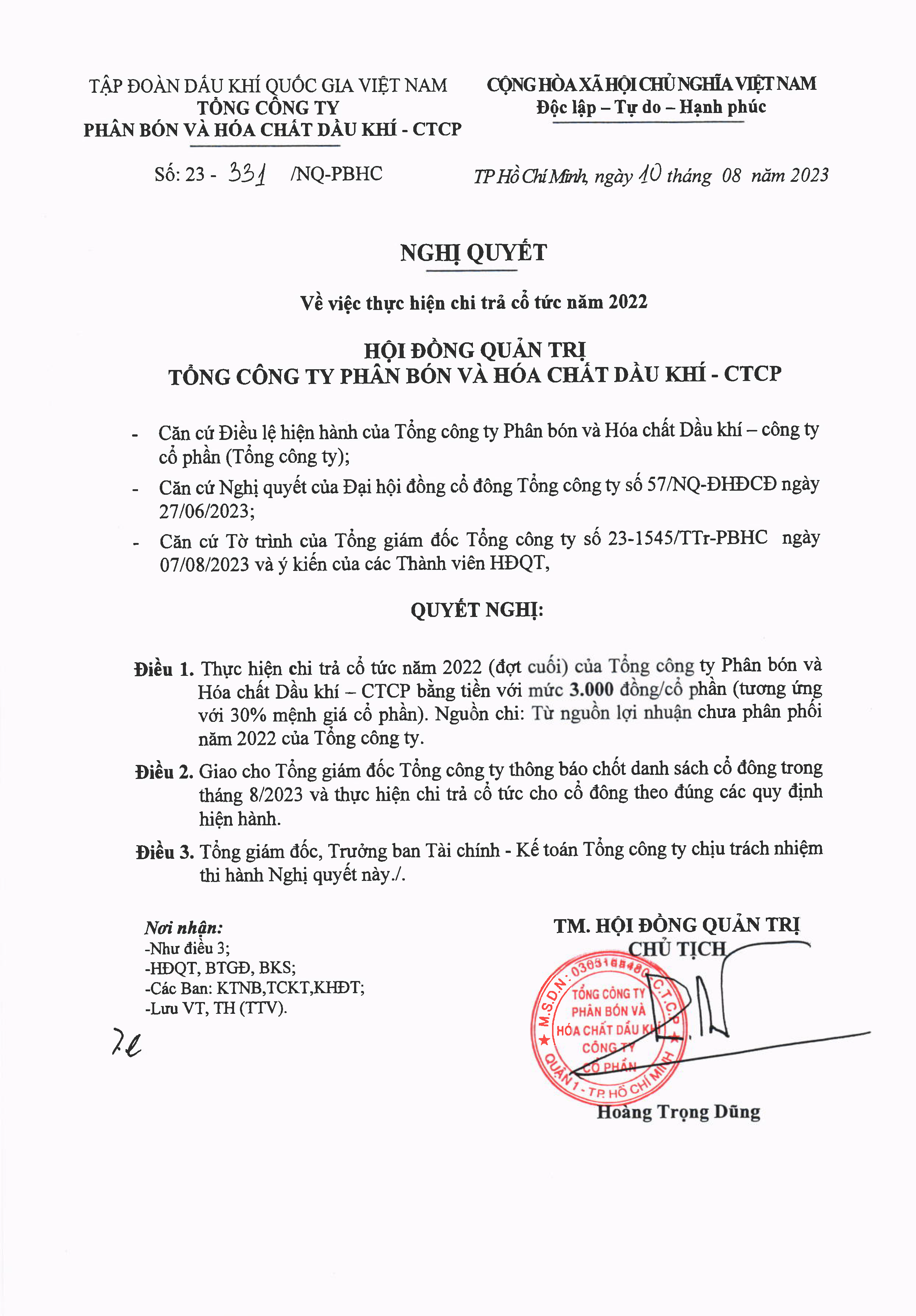 Công bố thông tin Nghị quyết HĐQT về việc thực hiện chi trả cổ tức 2022