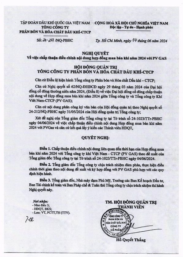 Công bố thông tin : Nghị quyết Hội đồng quản trị chấp thuận điều chỉnh Hợp đồng với bên có liên quan