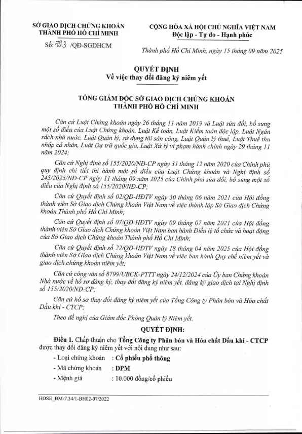 Ngày 16/9/2025 Tổng công ty Phân bón và Hóa chất Dầu khí – CTCP đã nhận được Quyết định số 793/QĐ-SGDHCM ngày 15/09/2025 của Sở Giao dịch Chứng khoán TPHCM về việc đăng ký thay đổi niêm yết. Theo đó, Tổng công ty được chấp thuận niêm yết bổ sung 288.590.761 cổ phiếu DPM, ngày hiệu lực là 17/09/2025. Tổng số cổ phiếu DPM niêm yết sau thay đổi là 679.990.761 cổ phiếu.