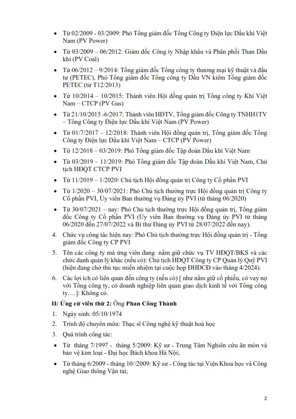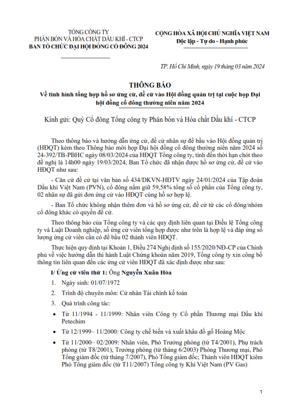 Căn cứ danh sách và hồ sơ ứng cử viên hợp lệ do các cổ đông đề cử, ứng cử gửi đến Tổng công ty theo thời hạn tại Thông báo mời họp Đại hội đồng cổ đồng cổ đông thường niên năm 2024, Tổng công ty xin thông báo đến Quý Cổ đông thông tin liên quan đến các ứng cử viên để bầu vào Hội đồng quản trị tại kỳ họp Đại hội đồng cổ đồng cổ đông thường niên năm 2024 như đính kèm.