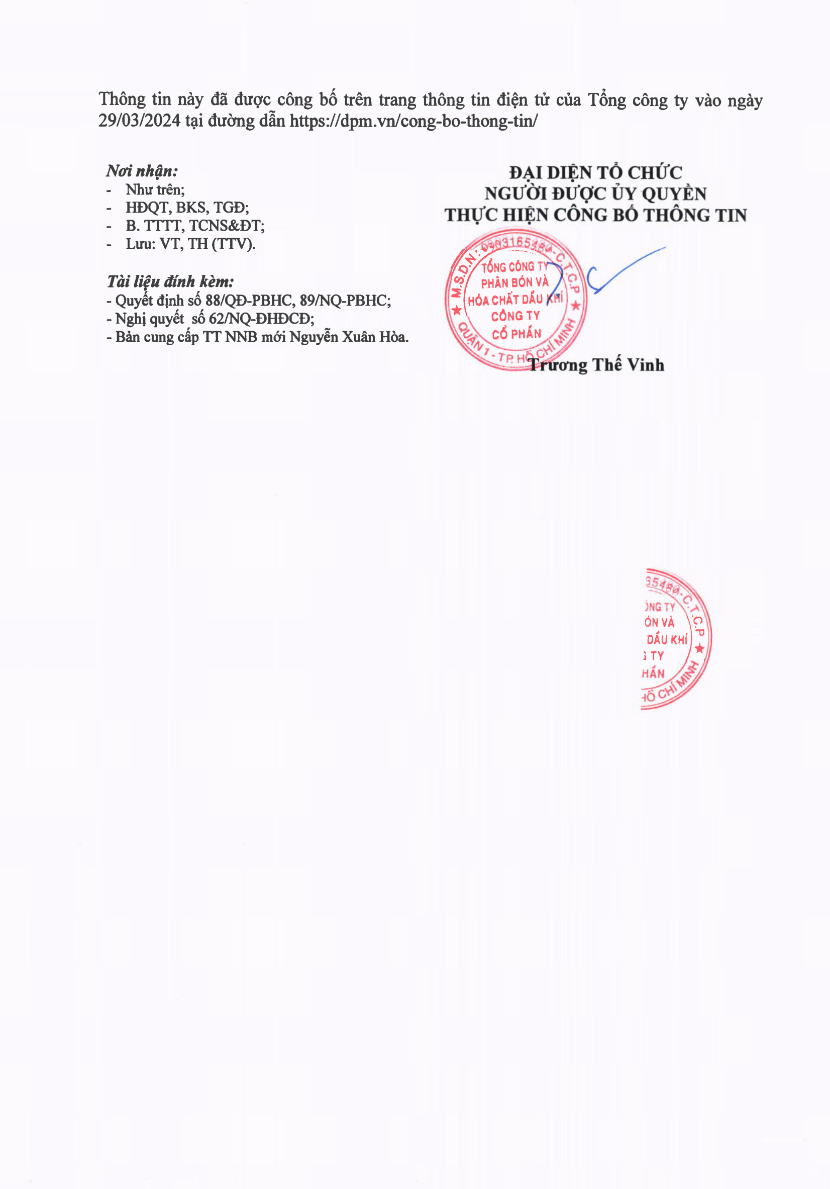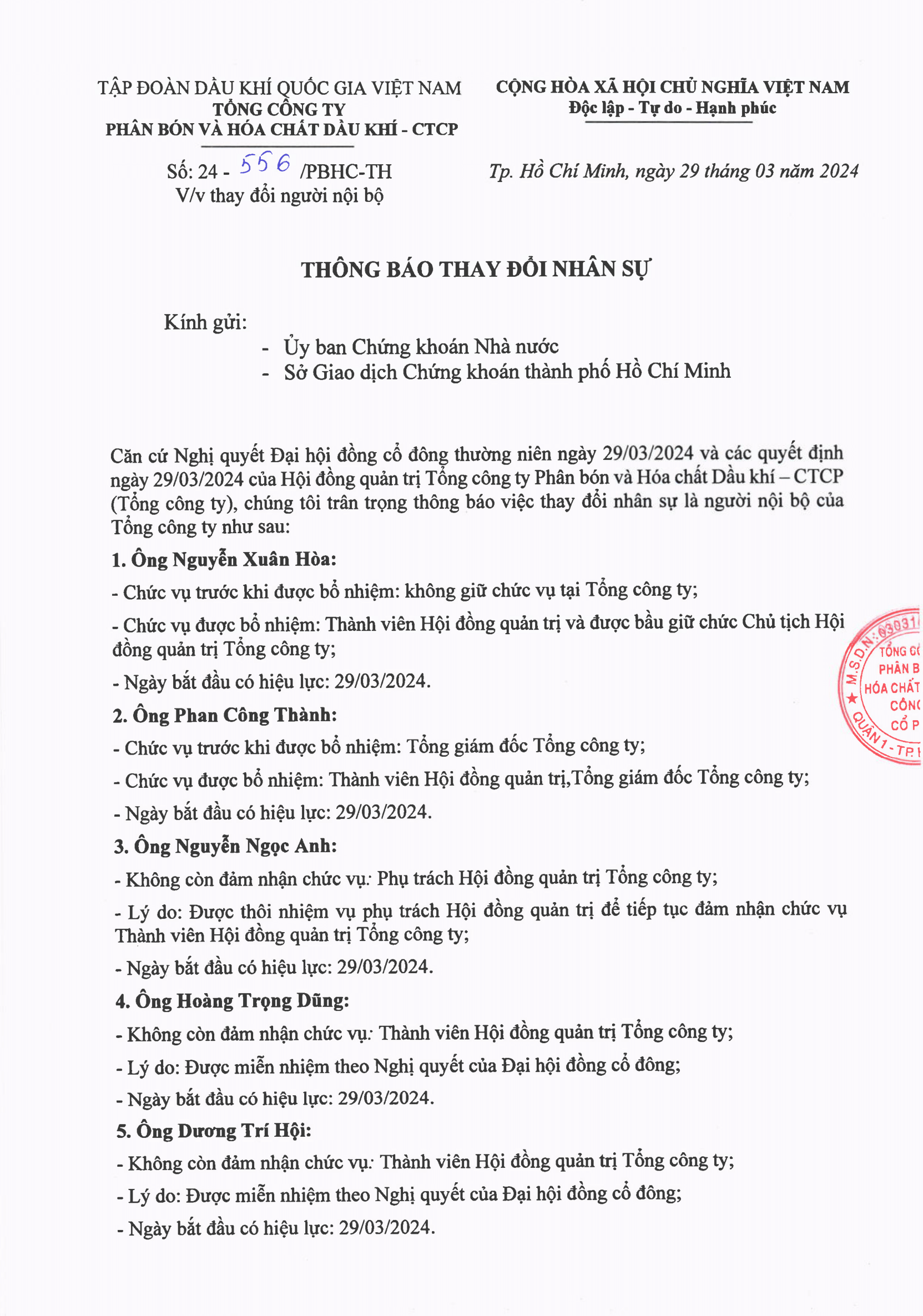 Công bố thông tin: Thông báo về việc thay đổi người nội bộ