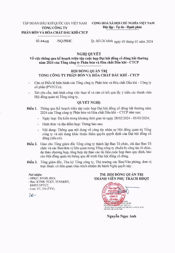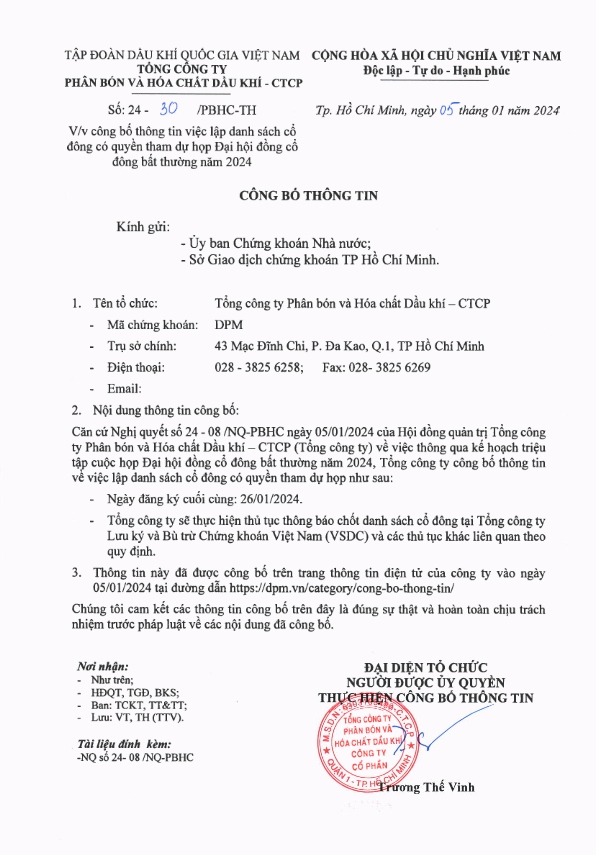 Công bố thông tin về việc lập danh sách cổ đông có quyền tham dự họp ĐHĐCĐ bất thường 2024