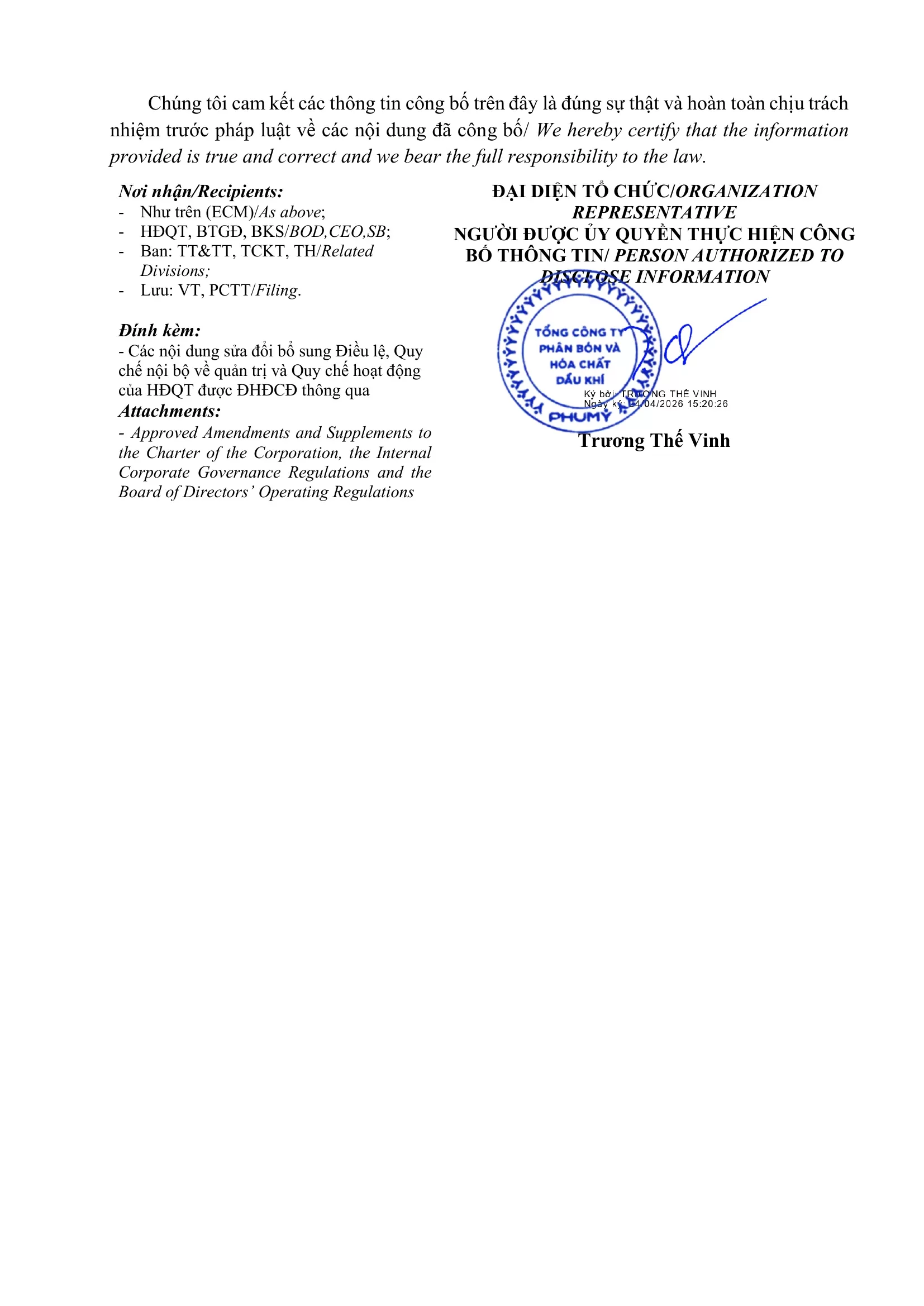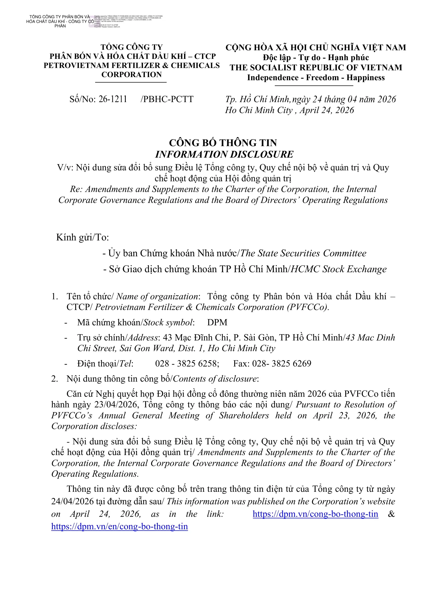 Công bố thông tin: Về việc Nội dung sửa đổi bổ sung Điều lệ Tổng công ty, Quy chế nội bộ về quản trị và Quy chế hoạt động của Hội đồng quản trị Tổng công ty Phân bón và Hóa chất Dầu khí - CTCP