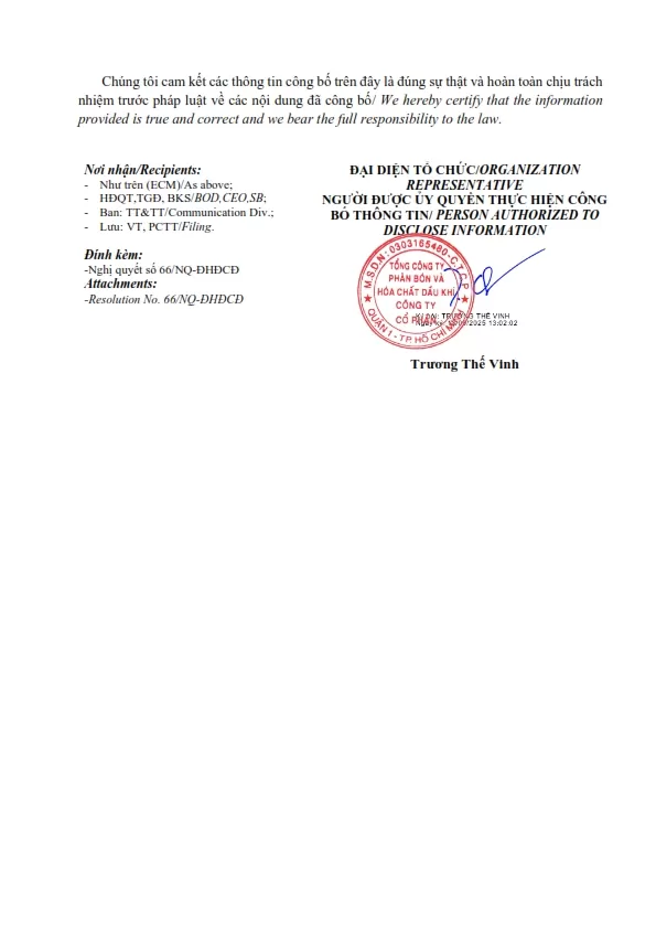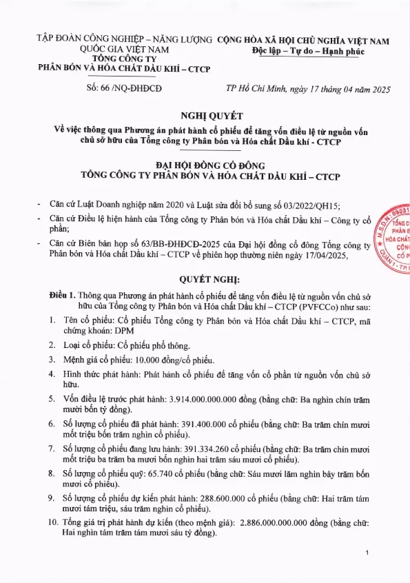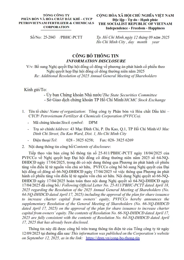 1 Công bố thông tin: v/v Bổ sung Nghị quyết Đại hội đồng cổ đông về phương án phát hành cổ phiếu theo Nghị quyết họp Đại hội đồng cổ dông thường niên năm 2025