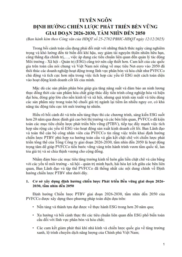 Tuyên ngôn định hướng chiến lược phát triển bền vững giai đoạn 2026-2030, tầm nhìn đến 2050.