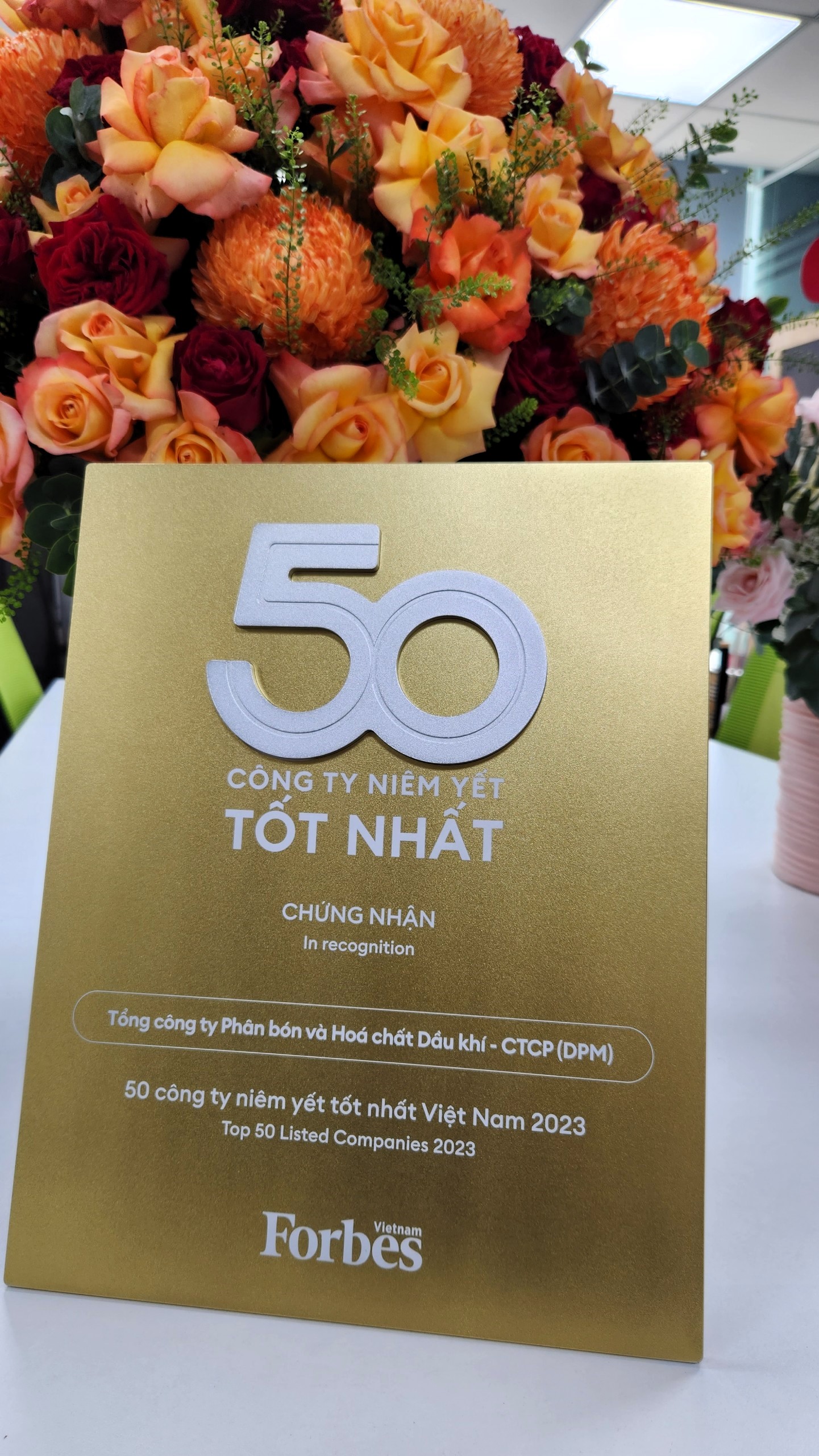 Ngày 17 tháng 08 năm 2023 ; trong khuôn khổ Diễn đàn Kinh doanh 2023 – một sự kiện thường niên do Tạp chí Forbes Việt Nam tổ chức, Tổng Công Ty Phân Bón và Hóa Chất Dầu Khí – PVFCCo (mã chứng khoán: DPM) tiếp tục được vinh danh trong “Top 50 công ty niêm yết tốt nhất Việt Nam 2023” do Forbes Việt Nam tổ chức đánh giá.