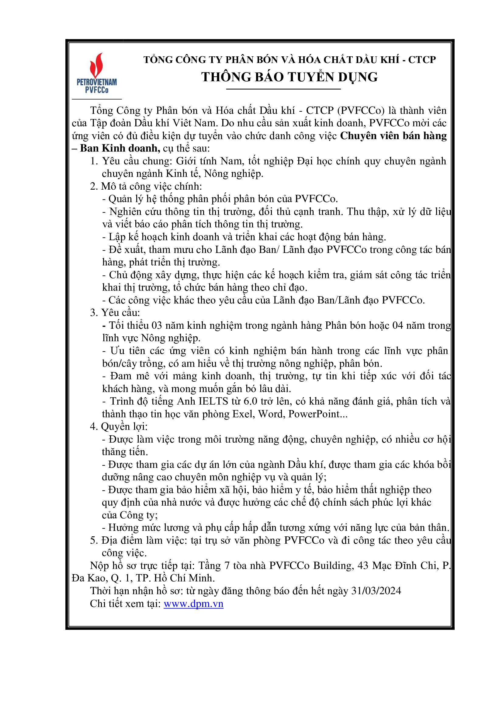 Thông báo tuyển dụng: Chuyên viên Ban Kinh doanh Tổng Công ty