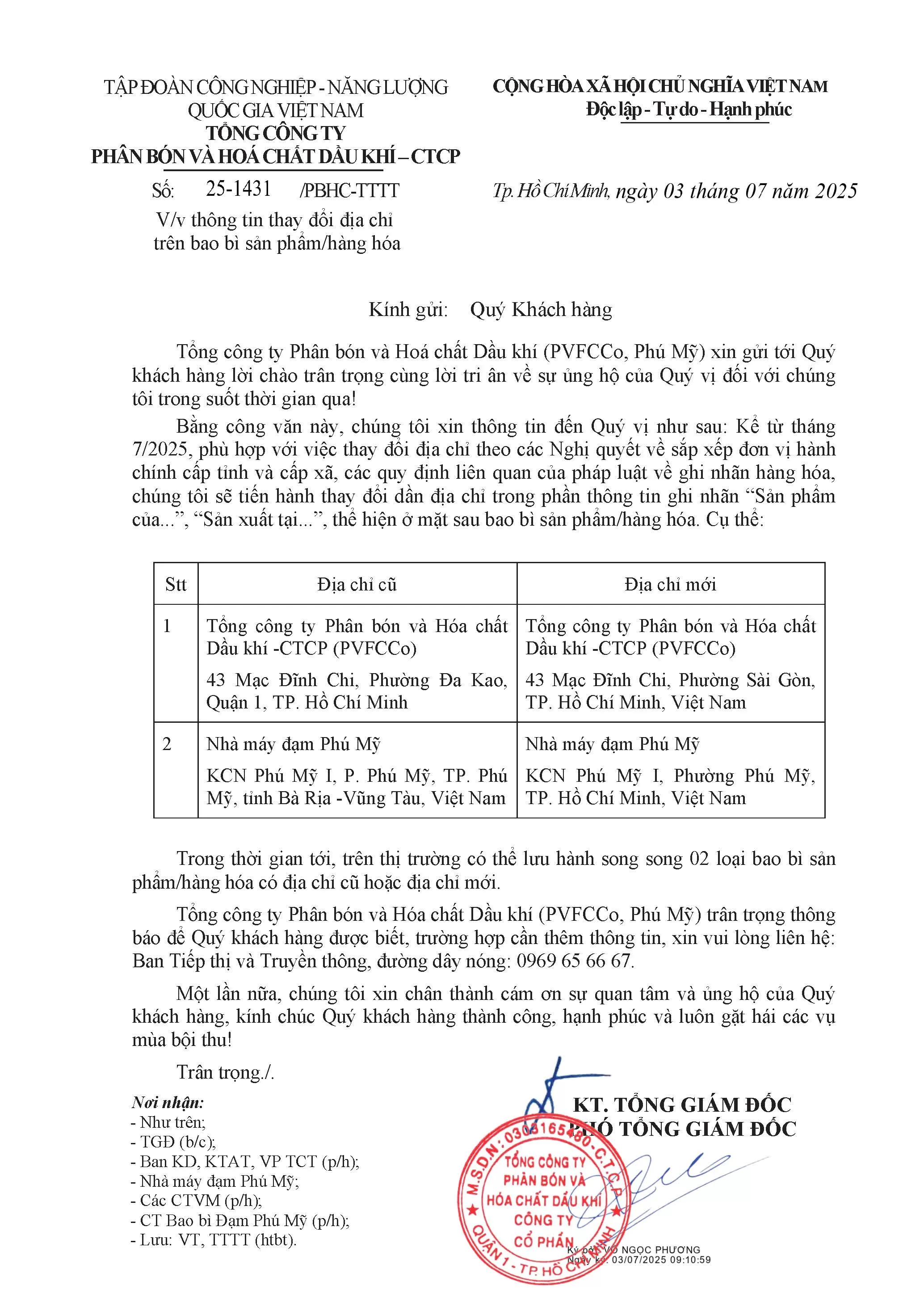 Thông báo V/v thông tin thay đổi địa chỉ trên bao bì sản phẩm/hàng hóa