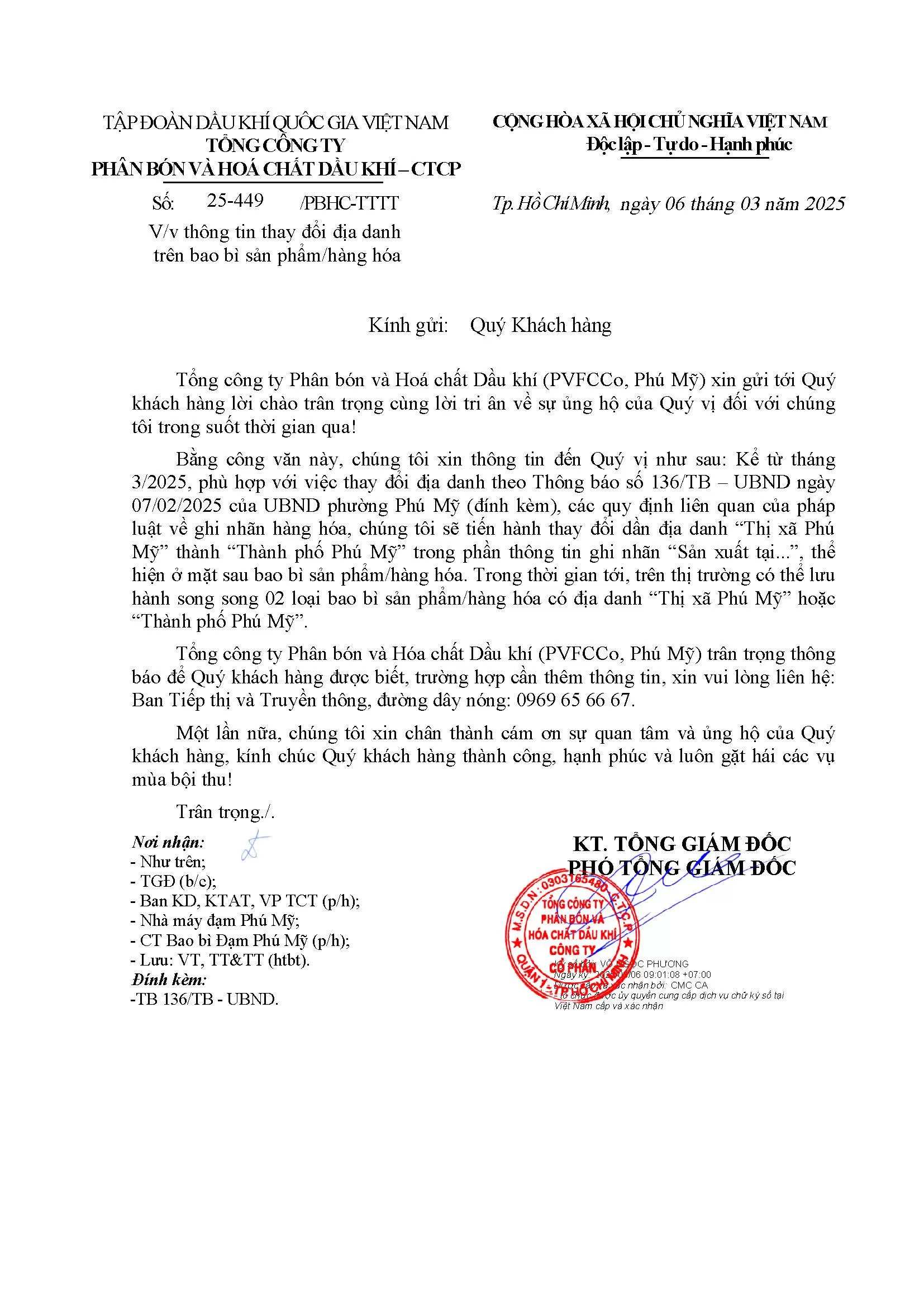 Thông báo V/v thông tin thay đổi địa danh trên bao bì sản phẩm/hàng hóa